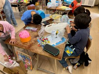 12月15日(木)4時間目、2年2組は図工で帽子に飾りをつけていました。