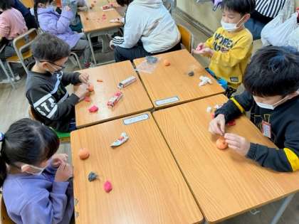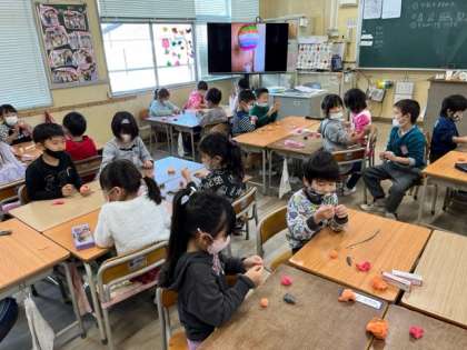 12月20日(火)1時間目、1年1組は図工で「気球」に乗せる人(自分?)を作っていました。粘土に絵の具を混ぜ頭や顔や髪の毛を作っていました。