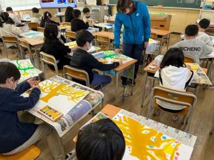 1月11日(水)4時間目、3年1組は図工で「モチモチの木」を描いていました。太い幹に黄色でふちどりをすると、なんだか雰囲気がでてくるなあと思いました。