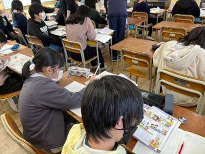 1月11日(木)2時間目、6年1組は算数で「マテマランドを探検しよう」を学習していました。これまで学習した知識や技能を動員して解いていく問題のようです。