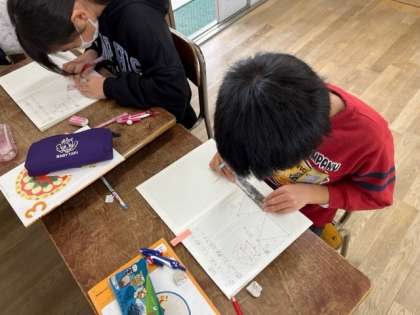 1月16日(月)4時間目、3年2組は算数でコンパスを使って二等辺三角形をかいていました。正しく書けたかものさしで測って確かめているっ人もいました。