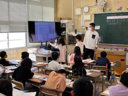 1月17日(火)3時間目、1年2組は算数でかずを数字やブロックで表す学習をしていました。3人の人が、自分のノートを拡大して見せて説明していました。