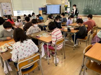 1月17日(火)、3時間目、4年2組は国語で百人一首のかるたをしていました。