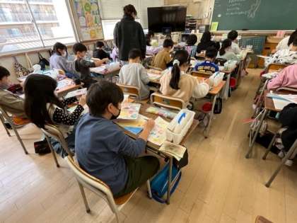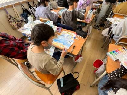 1月17日(火)3時間目、4年1組は図工で、「作品がすてきに見える背景をかこう」というめあてで背景をぬっていました。