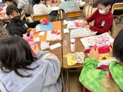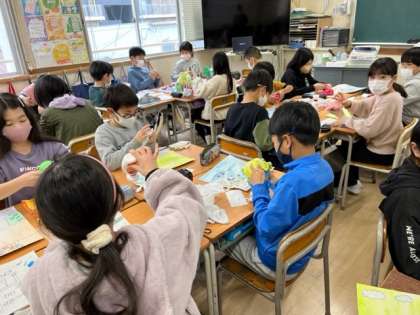 1月18日(水)1時間目、4年1組は図工で軍手を使って作品を作っていました。おもしろそうなものが出来上がりそうです。
