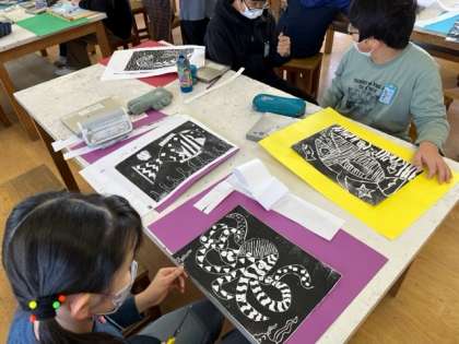 1月20日(金)1時間目、5年2組は図工で版画をしていました。版画のテーマは海の生き物です。白黒の模様のついた生き物がたくさん生まれていました。