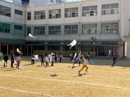 1月20日(金)4時間目、1年1組は生活科でたこあげをしていました。風が吹いていないので子どもたちは走ってたこをあげようとしていました。