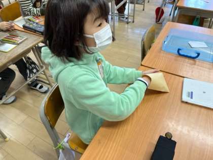 1月25日(水)1時間目、2年1組は国語で、昨日50円玉になぜ穴があるかを学習したことを、実際のお金を触って確かめていました。