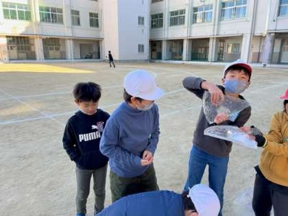 1月25日(水)休み時間、子どもたちは氷を触って感触を確かめていました。結構分厚い氷ができていました。水道の蛇口にはつららもできていました。