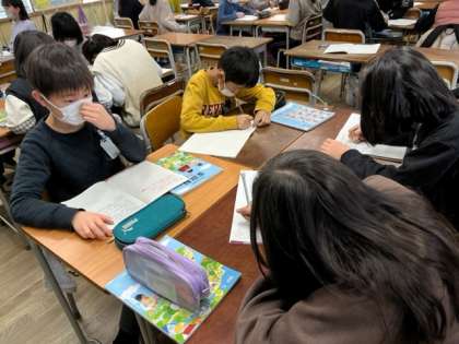1月26日(木)3時間目、5年1組は家庭科で昨日行った調理実習の振り返りをしていました。班で昨日の作業の反省をしたり、ご飯の炊き加減を話し合ったりしていました。