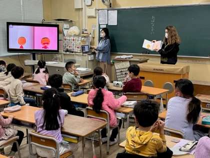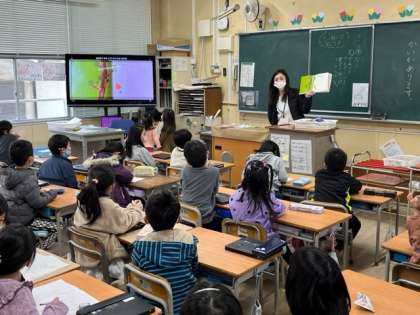 2月1日(水)1年生はお話会でした。「おはなしベル」の方に絵本の読み聞かせをしていただきました。絵本をモニターにも大きく映していただき、子どもたちは集中して聞いていました。