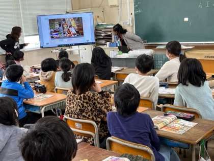 2月1日(水)3時間目、4年1組は外国語活動で、「What do you want?」「I want 〇〇,please.」を学習し、動画で世界の国々の様子を見ていました。