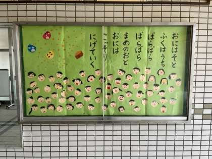 2月2日(木)玄関掲示が2月バージョンになっていました。「鬼は外、福は内」