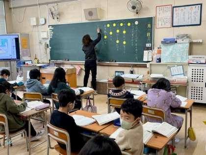 2月6日(月)1時間目、2年1組は国語で「二つのことばの音の高さに気をつけて言ってみよう。」というめあてで学習していました。「服をきる。」「画用紙をきる。」のような同音異義語のことを考えていました。