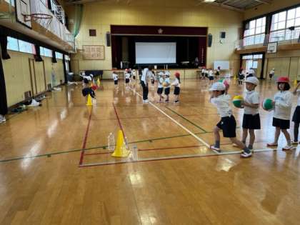 2月7日(火)2時間目、1年1組は体育館で、ボールを投げる練習をしていました。