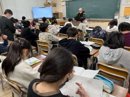 2月10日(金)3時間目、5年2組は理科でまとめプリントの「もののとけ方(1)」をしていました。答え合わせをしながら、復習をしていました。