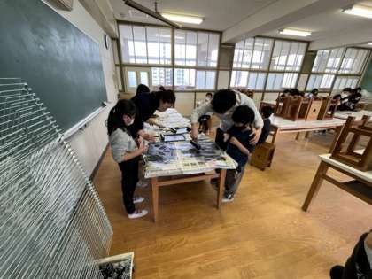 2月10日(金)3時間目、2年1組は図工で紙版画を刷っていました。順番を待っている人はかるたをしていました。