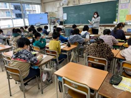 2月10日(金)3時間目、4年1組は国語でアンケートを作る学習をしていました。各班のアンケートを見て、こうしたほうがいいのじゃないということを交流していました。