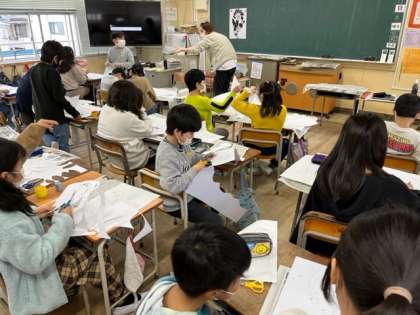 2月13日(月)2時間目、3年2組は図工で紙版画をしていました。画用紙にマヨネーズのボトルを4〜5本描いている人がいたので、聞いてみますとなんと花びらでした。一緒に笑いました。