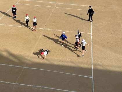 2月14日(火)1時間目、4年2組は体育で、タグラグビーをしていました。タグを取られないようにして走り抜けてトライしようとしていました。