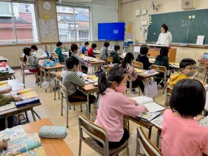 2月15日(水)1時間目、2階から楽しそうな歌声が聞こえてくるので、見に行きますと2年1組でした。次に雰囲気が変わって「夕やけこやけ」を歌い始めました。言葉の意味から確かめていました。