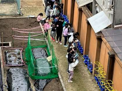 2月20日(月)4時間目、1ねん1組は生活科でチューリップの観察をしていました。「きゅうりみたい。」と何度も言ってくる子がいました。寒い冬を超えて芽を出してきたチューリップを見ると春が近づいていているんだなと感じました。