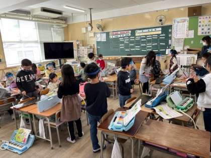 2月20日(月)5時間目、1年1組は音楽で「こいぬのマーチ」の合奏の練習をしていました。
