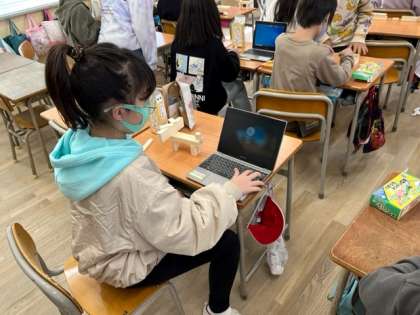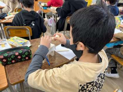 2月21日(火)4時間目、3年生は1組も2組も図工で「くぎうちトントン」をしていました。材料の木片を組み立てて何を作ろうか創造を広げているようでした。