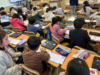 2月28日(火)1時間目、1年2組は国語で漢字の練習をしていました。