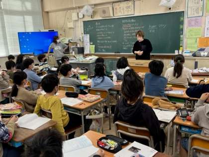 3月1日(水)1時間目、4年1組は社会科で豊中市の多文化共生のまちづくりについて学習をしていました。学習の中で、先生の英語学習の経験のお話を聞いていました。
