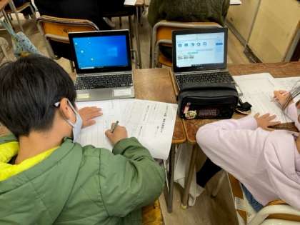 3月2日(木)1時間目、3年2組は国語で「人をつつむ形 世界の家めぐり」で自分でどこの地方かを選んで家についてパソコン等で調べてまとめていました。