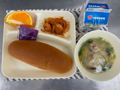 給食の中華がゆは、米のほかに、肉だんご、だいこん、チンゲンサイ、にんじん、しいたけを加えて作ります。塩、薄口醤油、チキンブイヨンで味つけし、仕上げにごま油で風味をつけています。