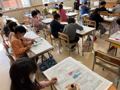 3月15日(水)1時間目、2年1組は作品袋に絵を描いていました。