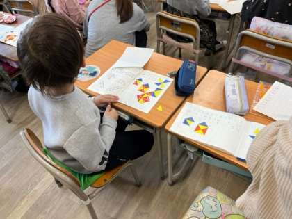 3月16日(木)1時間目、1年1組は算数で三角形を使って魚の形を作っていました。