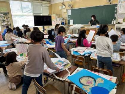3月20日(月)4時間目、1年1組は図工で作品を作品袋に整理していました。