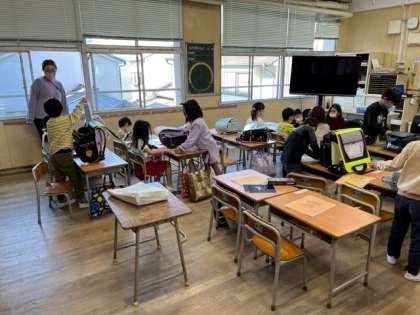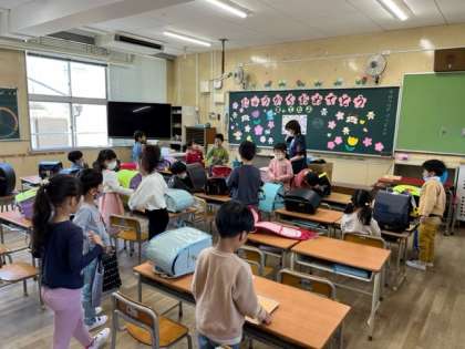 4月10日(月)1年生は1組も2組も学級活動で、ランドセルの置き場所やお道具箱の机への入れ方を学習していました。