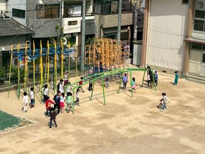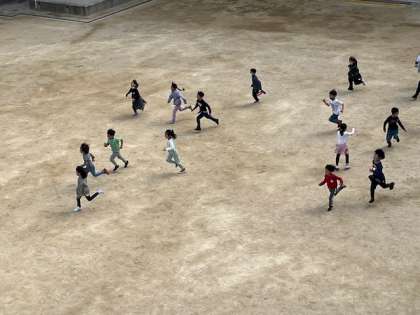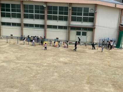 4月11日(火)2時間目、1年生は1組も2組も運動場で遊んでいました。遊具や鉄棒、一輪車、竹馬などを使って遊びました。