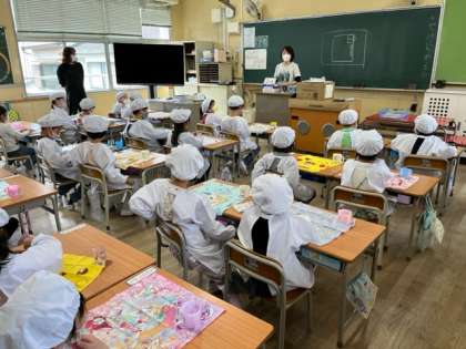 4月11日(火)3時間目、1年1組は給食のエプロンを着る練習をし、給食の仕方を教えていただいていました。