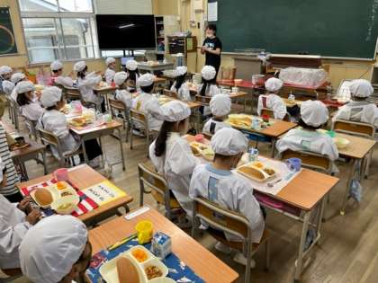 4月12日(水)今日も6年生が1年生の給食を手伝ってくれました。今日の献立は、じゃがいものミートグラタン、レタスのスープ、缶みかん、パン、牛乳です。残さず食べられたかな?