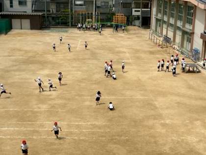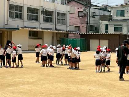 4月18日(火)3時間目、2年生は運動場で体育をしていました。登り棒を登れた人は運動場の反対側まで走りもどってきます。登り棒で苦戦している人が結構いるようです。その後、二人組で「鍋鍋底抜け」をしていました。二人から四人とレベルアップしていましたが、できたのでしょうか?