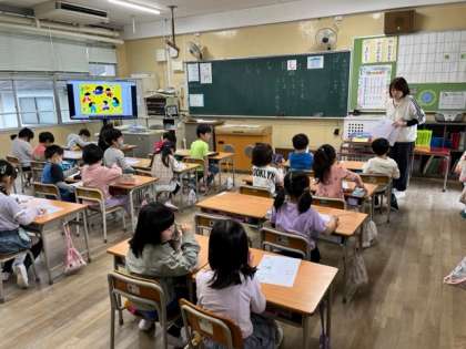 4月19日(水)1時間目、1年1組は国語でひらがなの「し」を学習した後、「さあはじめよう たん たん たん」を学習していました。