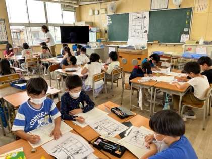 4月21日(金)1時間目、3年1組は社会科で校区の地図で自分の家がどのあたりかを調べていました。3年生の子どもたちにとって、地図をみて場所を考えるのは意外と難しいものです。