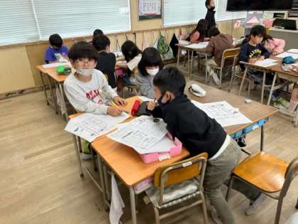 4月24日(月)1時間目、3年2組は社会科で校区の地図を使って校区内のことを学習していました。いろいろなものを記号で表そうとしていました。
