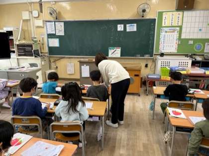 4月25日(火)1時間目、1年1組は国語でひらがなの「う」の練習をしていました。