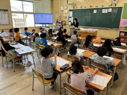 4月27日(木)4時間目、1年2組は国語で「か」「さ」の後「あいうえお」の復習をしていました。