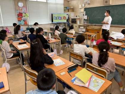 4月28日(金)4時間目、4年2組は外国語活動で英語の歌を歌っていました。先日2年生の教室から聞こえてきた「子犬のビンゴ」を英語で歌っています。手拍子を入れて楽しそうに歌っていました。
