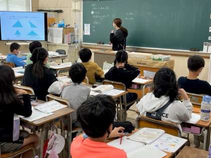 5月2日(火)1時間目、5年2組は算数で三角形の3つの角の和は180°を使って問題を解いていました。