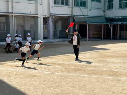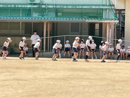 5月2日(火)1時間目、4年生は体育で50m走のタイムを測っていました。また、反復横跳びの動きの練習もしていました。