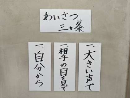 5月9日(火)4年2組前の廊下の壁に「あいさつ三ヵ条」がありました。過日の授業で話し合われたものだと思われます。