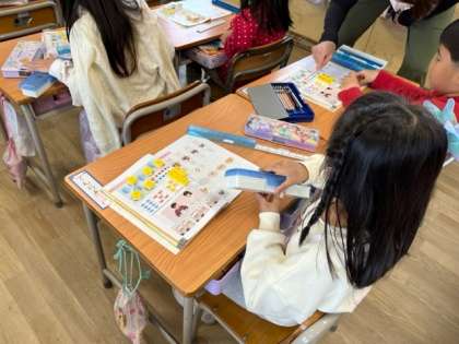 5月9日(火)1時間目、1年2組は算数で「どちらが おおい」を学習していました。数えるものにブロックを置いてブロックの数で比べていました。